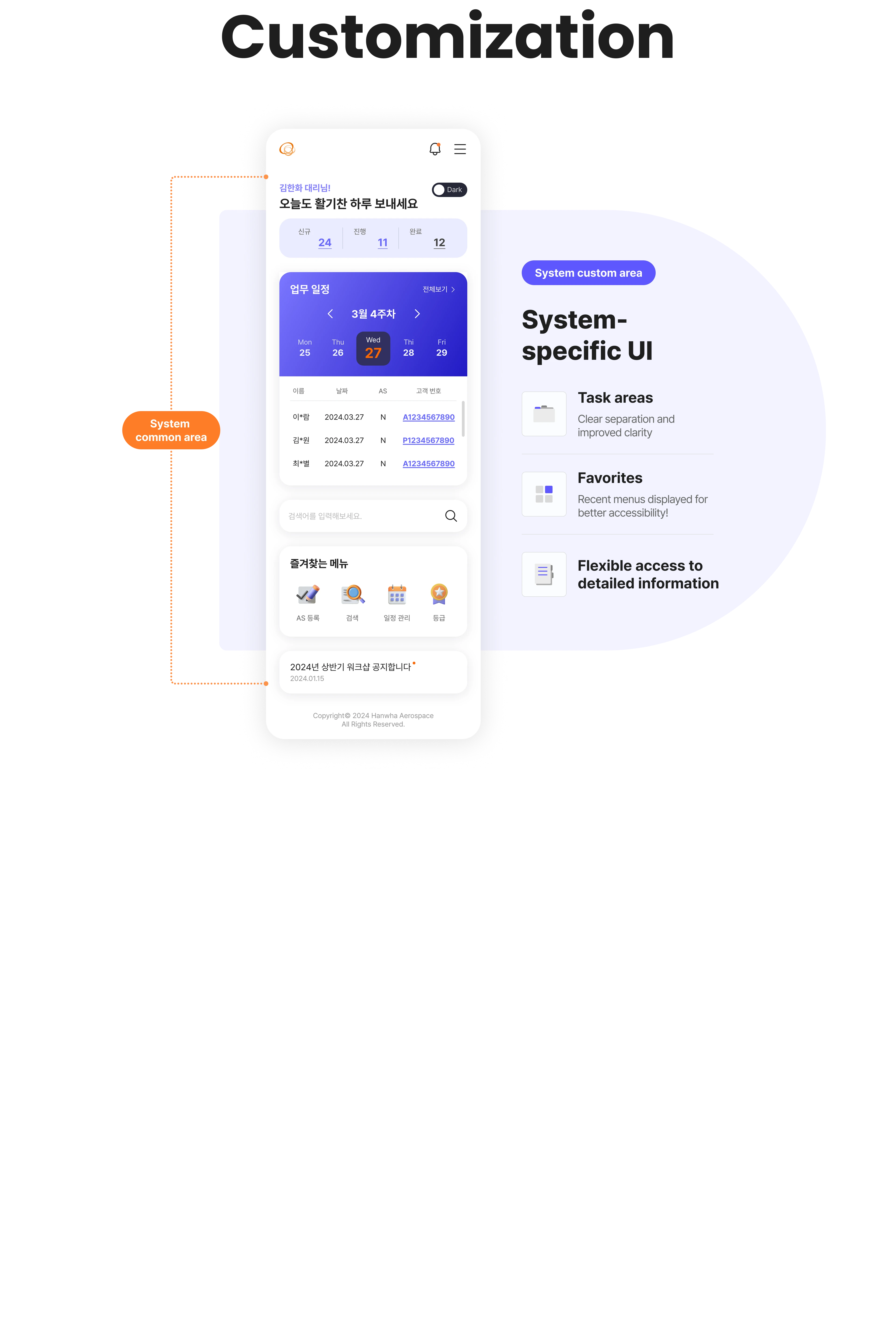 Hanwha Aerospace’s next-generation One-ERP system supports the extensive operations of three defense affiliates through a user-centered integrated platform. To enable key tasks on mobile, a new mobile web system was developed based on the existing web environment. The system includes three modules, each refined through workflow analysis to enhance usability and streamline work efficiency.