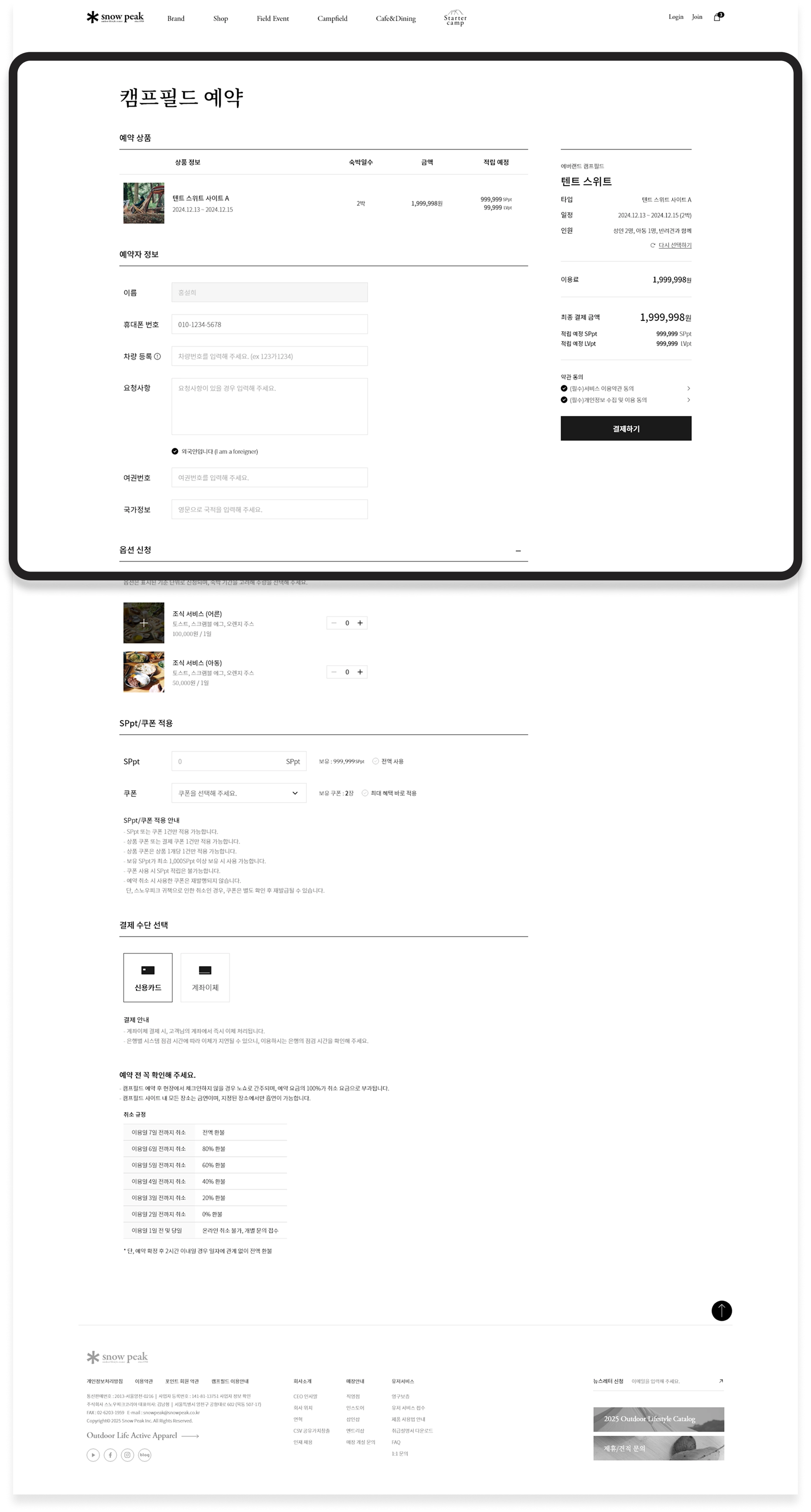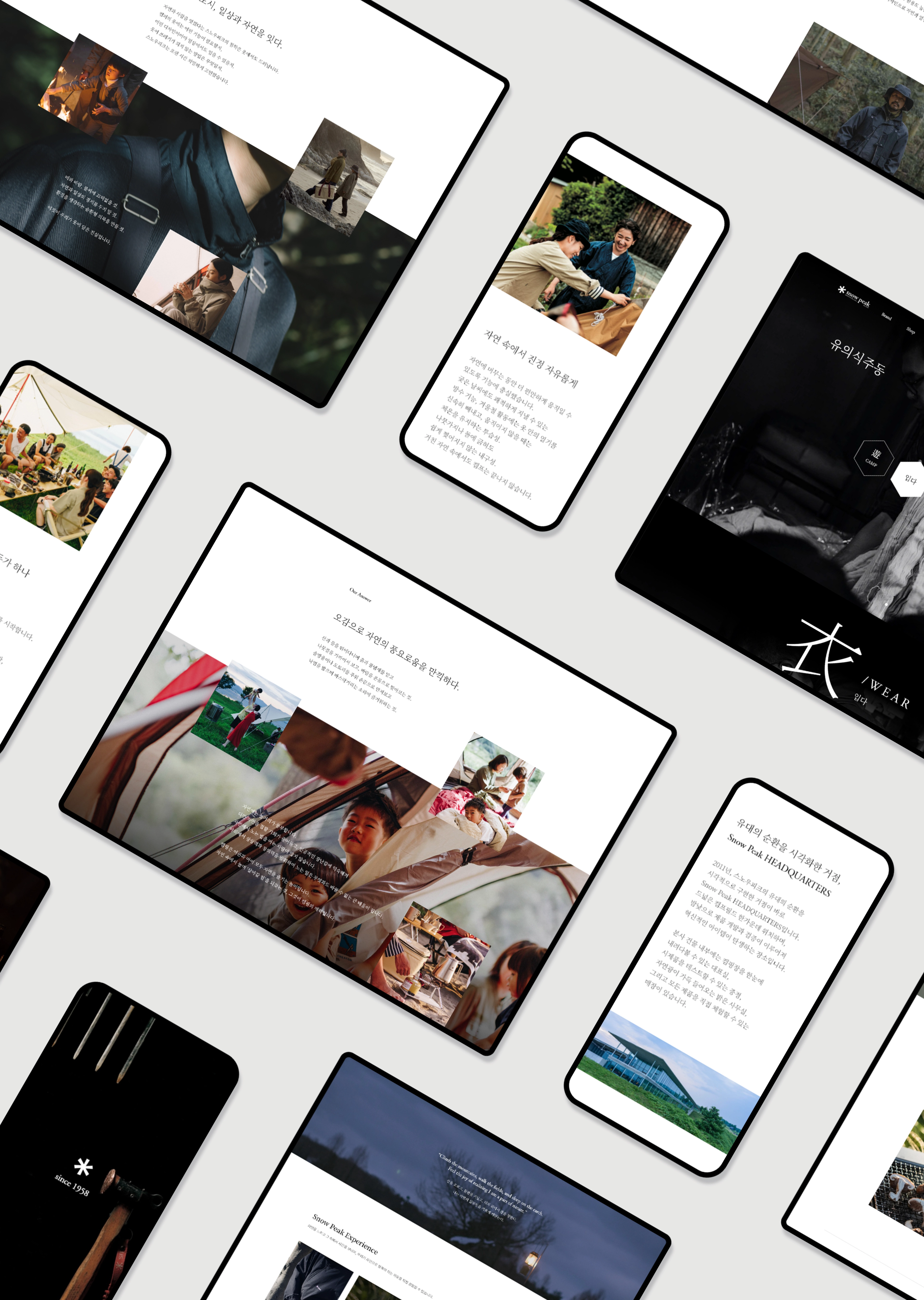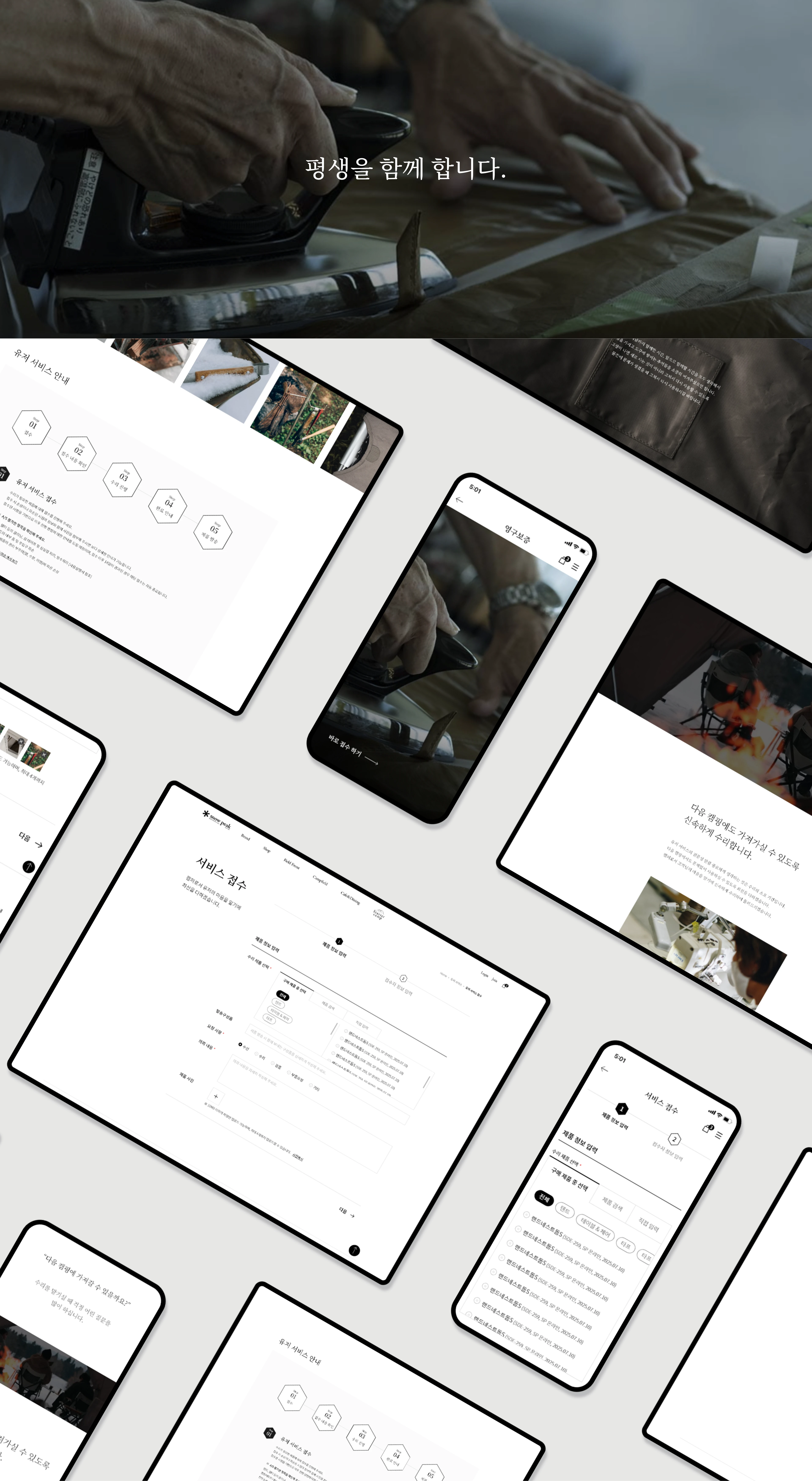 오랜 시간의 가치를 이어가는 사용자 경험 스노우피크의 유저서비스는 단순한 A/S 접점이 아닌, 제품의 수명과 사용자와의 관계를 이어가는 지속 가능한 경험을 제안합니다. 서비스 접수, 부품 요청, 사용 가이드, 취급 설명서, FAQ 등 다양한 기능은 최소한의 경로로 필요한 정보에 도달할 수 있도록 설계되었으며, 직관적 UI와 명료한 동선 설계를 통해 사용자는 브랜드의 철학인 “버려지지않고 오랫동안 함께하는 제품” 의 가치를 온라인 환경에서도 직접 체감할 수 있습니다. 그 결과, 10년, 20년이 지나도 변하지 않는 신뢰와 기능을 담은 스노우피크만의 지속 가능한 사용자 경험이 완성되었습니다.